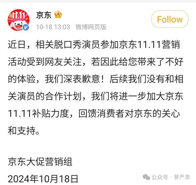 于是京东取消了和杨笠的合作,并发出了这则看似语焉不详的道歉信,实际上是表态以后永不合作杨笠。