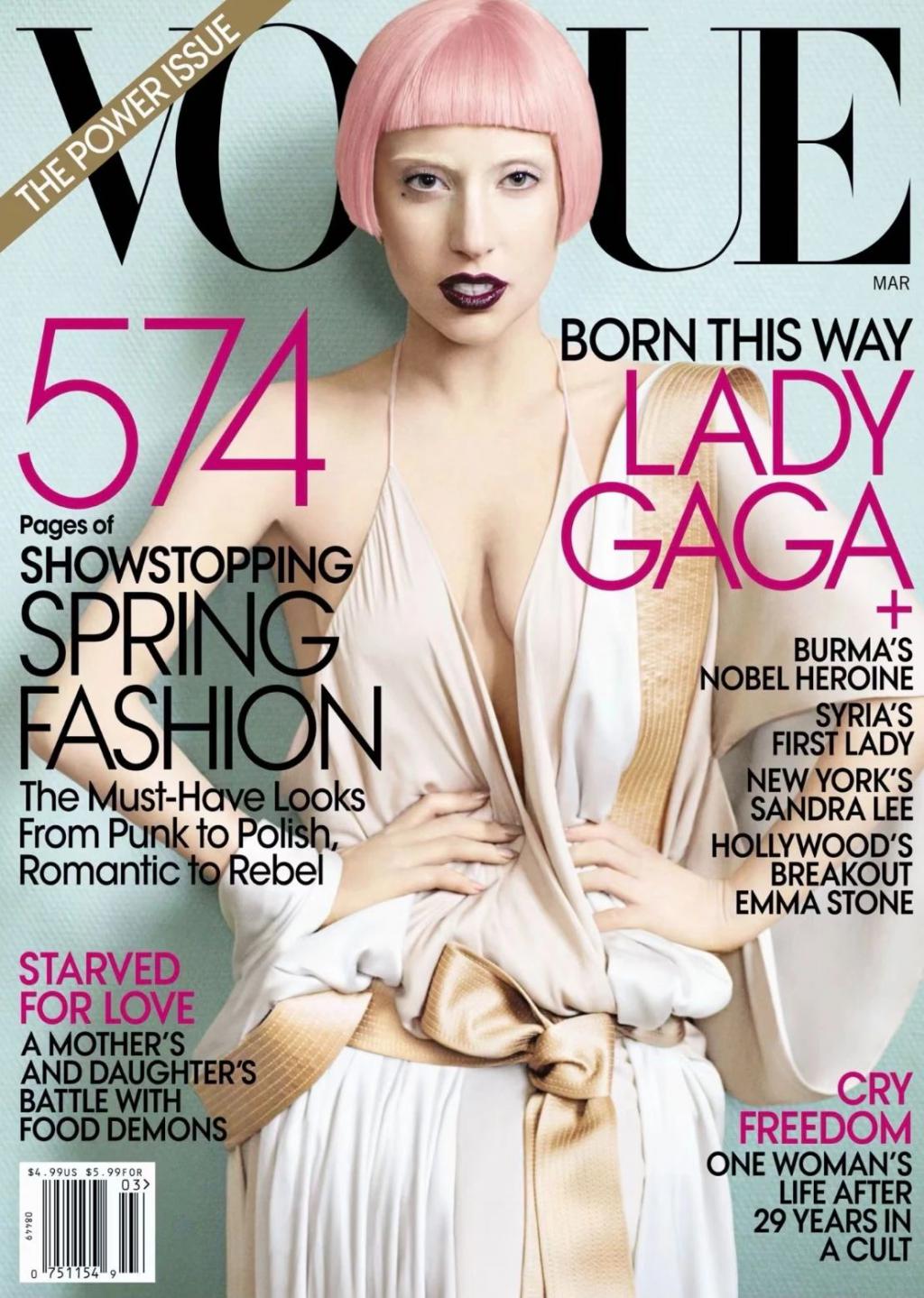 这不是 Lady Gaga 第一次登上《VOGUE》。早在 2011 年,人气如日中天时,Lady Gaga 就首登《VOGUE》,以一头粉色短发,白眉红唇的怪异造型现身。
