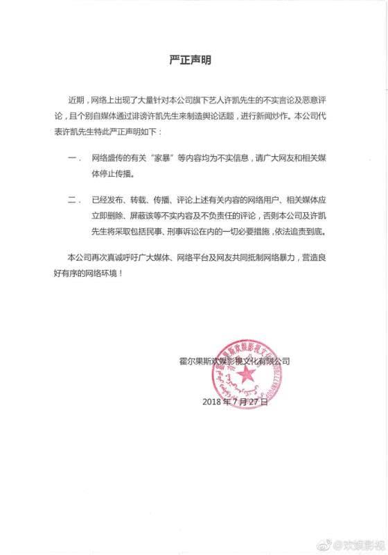今天,许凯的公司欢娱影视却发布声明否认这一消息,称有关许凯“家暴”的说法都是不实消息。许凯本人也发布微博称自己只是年轻时不懂事混蛋,承认自己做错事,但不承认自己家暴,只是“有争吵,有推搡,有撕扯”。