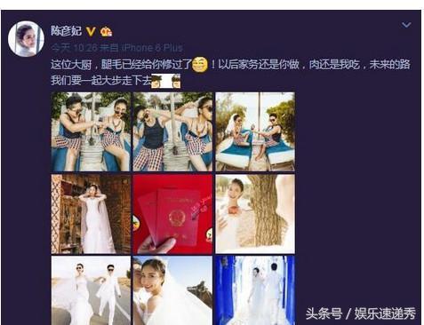 今天,陈彦妃晒出婚纱照和结婚证宣布大婚喜讯!还配文称: “这位大厨,腿毛已经给你修过了!以后家务还是你做,肉还是我吃,未来的路我们要一起大步走下去”还记得当年追过的偶像剧《星梦缘》吗?陈彦妃饰演的#林思彤# 博得了超多人的喜爱,消息一出网友纷纷送祝福。