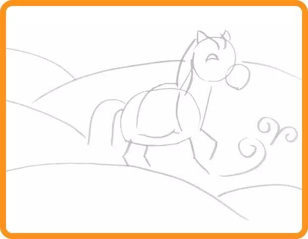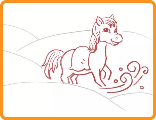 首先用铅笔轻轻画出小马过河的骨架图,注意整体构图比例。