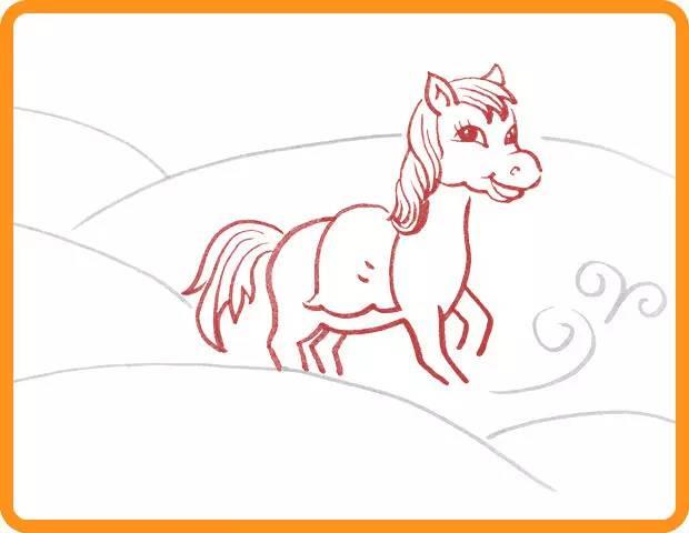 接着在铅笔描绘的草图中开始局部描实,先用彩色水笔画出小马的整体。