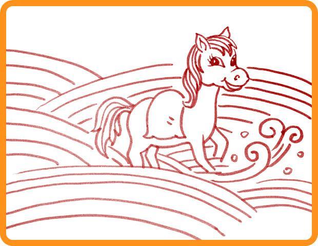 接续用彩笔描绘出小马过河图中的水花。