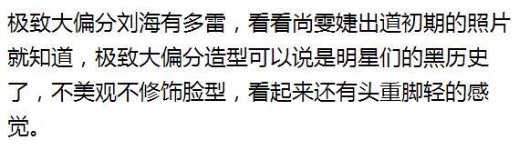 刘海是拯救发际线的利器。看唐嫣这左右对比图就能感受到,有了刘海的遮挡,别人就不知道你发际线到底有多高啦!