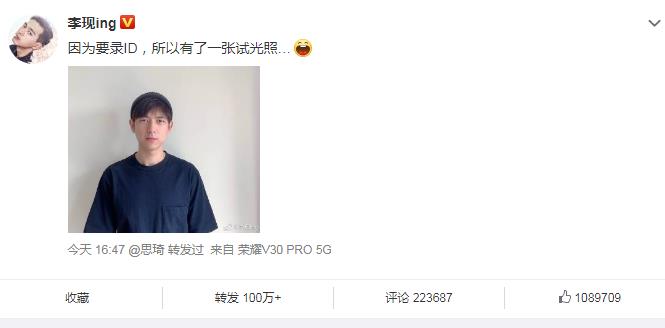 他发布动态说,因为要录ID,所以他拍了试光照。配图正是他的照片,穿着深蓝色的T恤,还戴了顶毛线帽子,素颜的他帅气干净,就像还在读大学的小年轻。很久没看到他发布新照片的粉丝们激动不已,超级开心的来夸爱豆帅气迷人,这条动态让网友们评论都多达20多万。