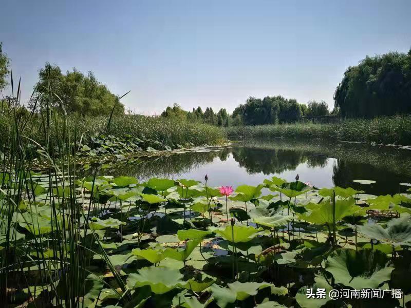 北龙湖湿地公园原地形是一片散乱的鱼塘,规划时因势利导设计为湿地,池塘丰富了景观,也带来了灵性,不同的湿地植物在四季错落生长,公园也显得生气勃勃。负责维护公园的新发展基础设施有限公司副总经理刘生荣说,公园遵循郑东新区海绵城市的设计理念,汇集雨水、过滤雨水:“这个水是和龙湖水贯通的,通过水生植物啊和沉水植物啊能让水质更清、更净。”