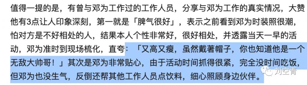 为了力证邓为的品德,甚至有工作人员出来爆料,邓为脾气很温柔,贴心,又是一个无敌大帅哥。