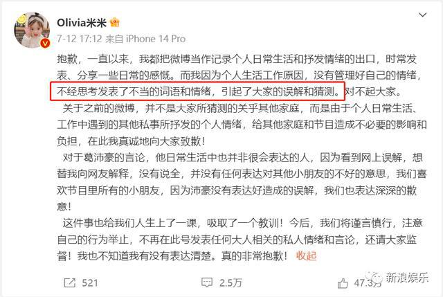 又在马立奥生日时特意发了条微博祝贺,还发了条长微博道歉,解释自己用女儿账号发那些引人联想微博的原因,同时保证以后谨言慎行。