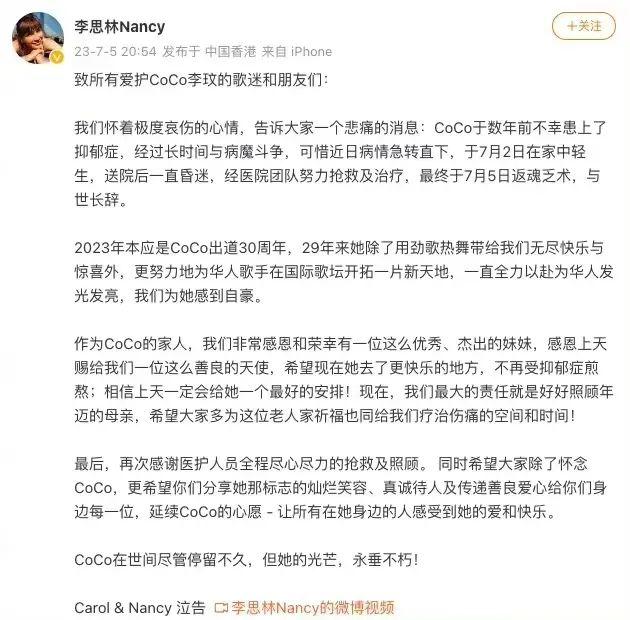 李玟家人发出讣告,证实李玟于 2023 年 7 月 5 日,因抑郁症轻生去世。