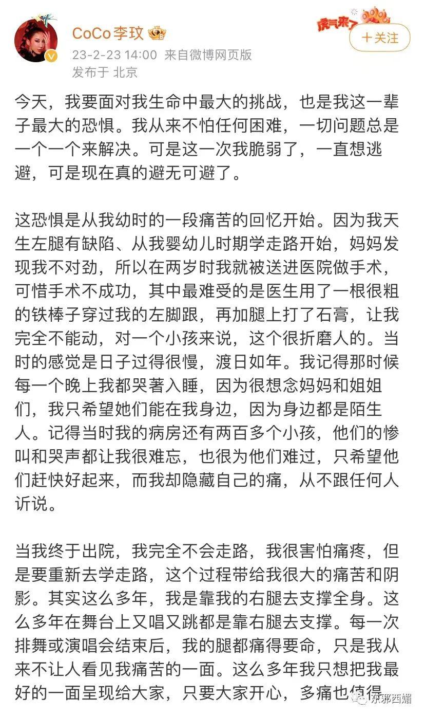 去年参加声生不息,很多人惊叹 47 岁的她状态怎么这么好,谁能想到舞台上魅力四射活力十足的 coco,笑容背后是用意志力强忍住的左腿痛楚,以及丈夫一次次的背叛。