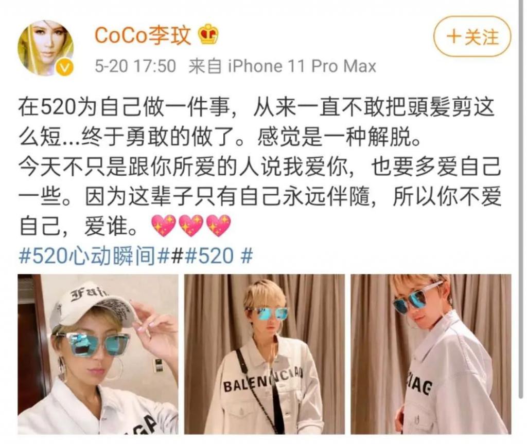 可等到 2020 年 520 那天,李玟忽然把头发剪得极短,并发文说:" 因为这辈子只有自己永远伴随,所以你不爱自己,爱谁 "。