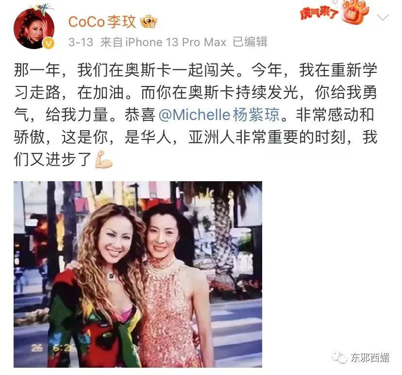 杨紫琼奥斯卡称后,她还发微博晒出两人合照庆贺对方,说自己在重新学走路;