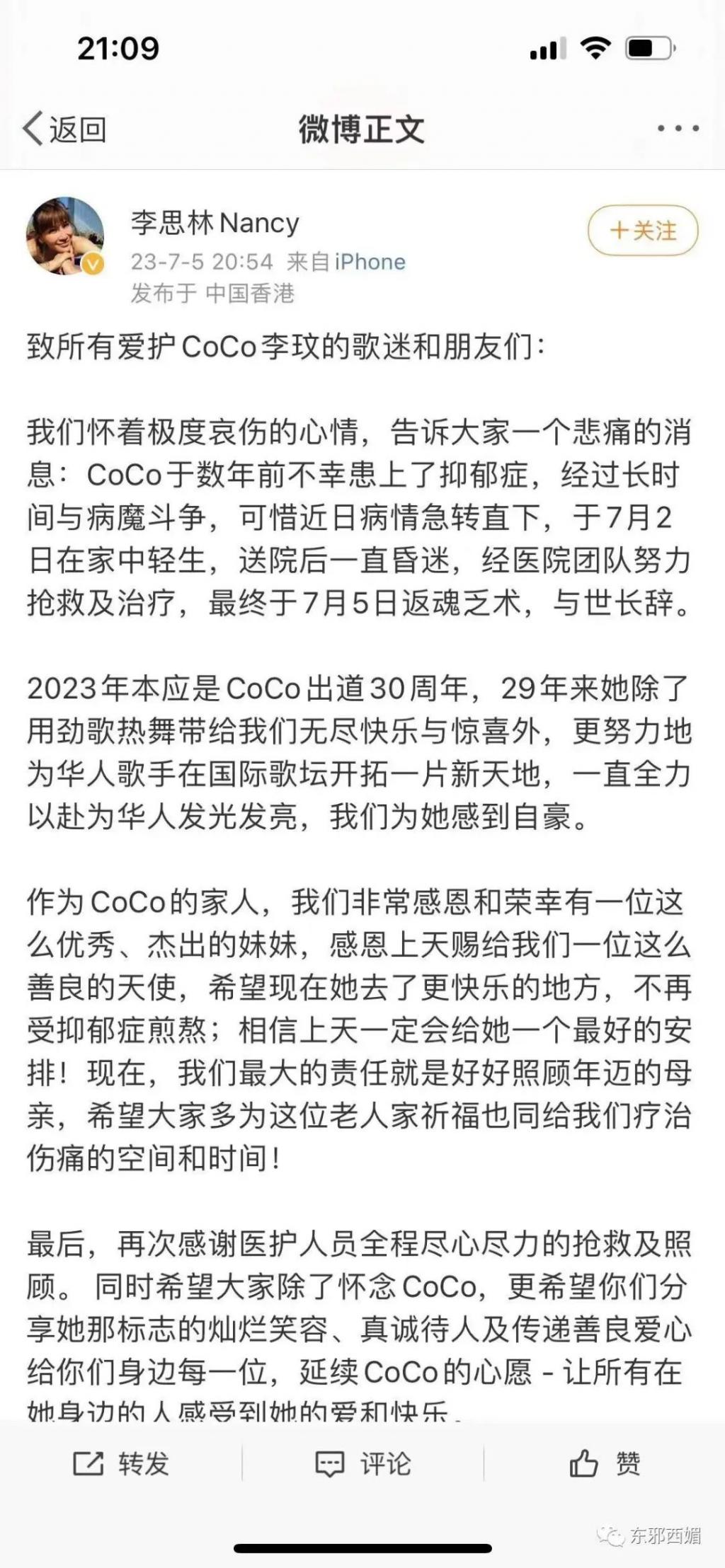 太太太太震惊了!李玟姐姐在今晚发文,称 CoCo 李玟多年前患上了抑郁症,于 7 月 2 号在家中轻生,7 月 5 日最终离世。