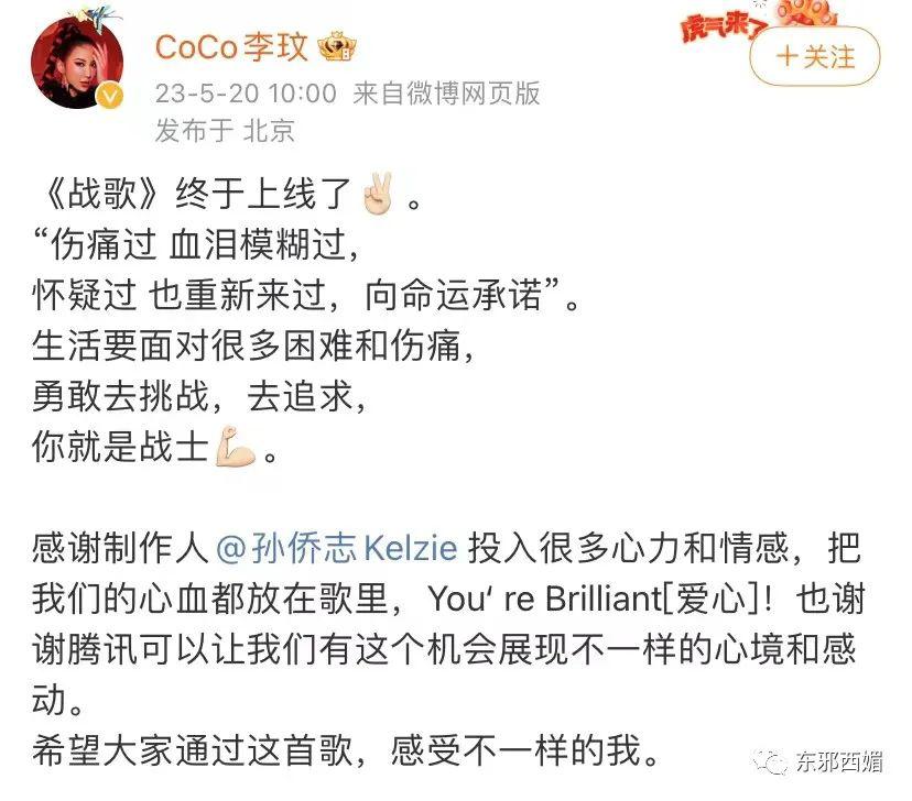 就在 5 月 20 号,她还发布了新歌,歌词正能量满满:" 生活要面对很多困难和伤痛,勇敢去挑战去追求,你就是战士。"