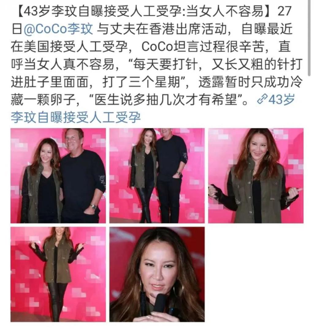 但 18 年接受采访时,李玟透露自己正在拼人工受孕,要知道当时她已经 43 岁了,因为过程太过辛苦,还忍不住对媒体说 " 女人不容易 "。