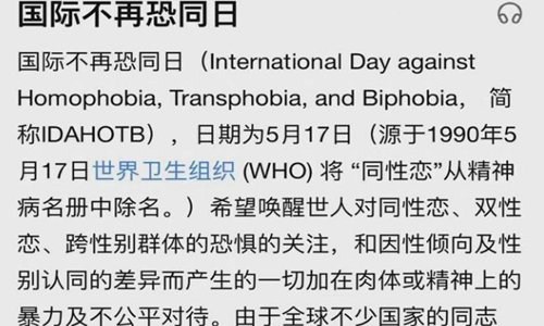 517(5月17日,星期一),国际不再恐同日。因为29年前的今天,即在1990年的5月17日,世界卫生组织(WHO)将同志(同性恋者、跨性别者与双性恋者)从“精神病名册”中移除,为了纪念这天大家就将5月17日定为“国际不再恐同日”。