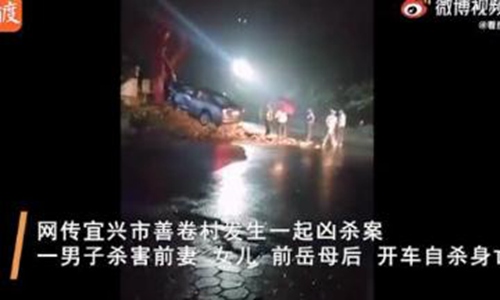 5月12日凌晨,江苏无锡市宜兴市张渚镇善卷村发生了一起凶杀案,一名男子杀害前妻、女儿、前岳母后,开车撞到离家约200米的村口雕塑身亡。