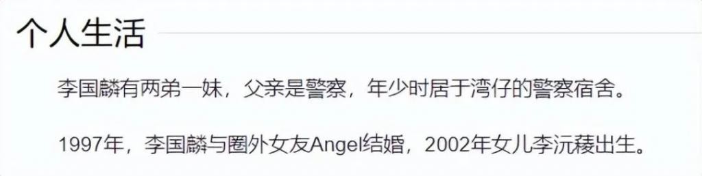 李国麟曾因实验鸠摩智走红,1997 年他与圈外老婆 Angel 低调结婚,两人感情一直很稳定,只不过李国麟很少透露与妻子有关的信息。