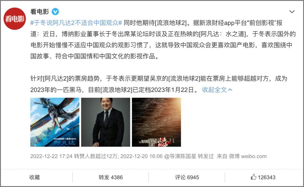 " 我们更希望银幕上看到中国人的故事,中国人的情感。我很期待的是《流浪地球 2》能够超越《阿凡达 2》。"