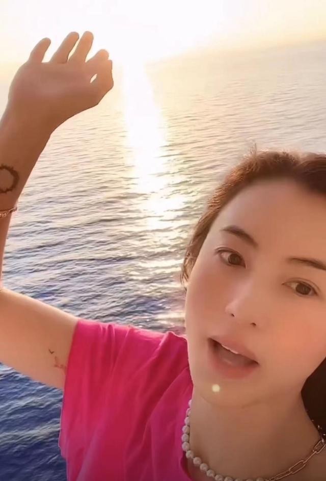 张柏芝坐游艇出海,手臂纹身被疑曝光三胎生父,素颜惹眼穿金戴银