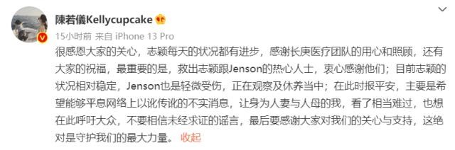 林志颖的老婆陈若仪看到那么多不实消息后也公开发声,表示希望能够平息网络上以讹传讹的不实消息,她透露志颖的状况每天都有进步,状况也相对稳定,Jenson 也是轻微受伤,正在观察和休养,陈若仪感谢医疗团队的照顾和用心,谢谢大家的祝福,也谢谢救出林志颖和孩子的热心人士,希望大家不要相信未经求证的谣言。