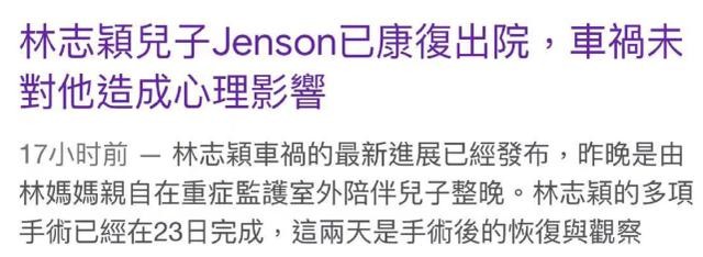 根据台媒 24 日发布的消息得知,林志颖的儿子 Jenson 由于受伤不严重,只是脸部有些轻微擦伤,目前孩子已经康复出院,由妈妈陈若仪将其带回了家安抚。