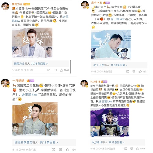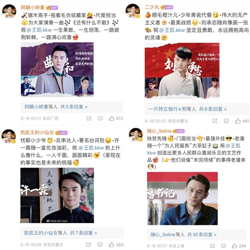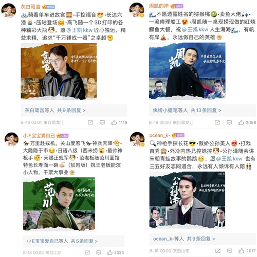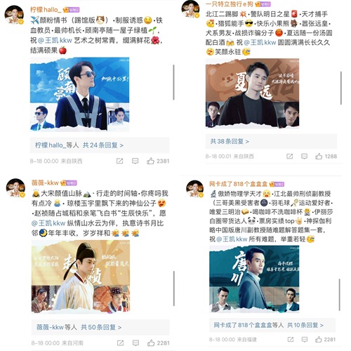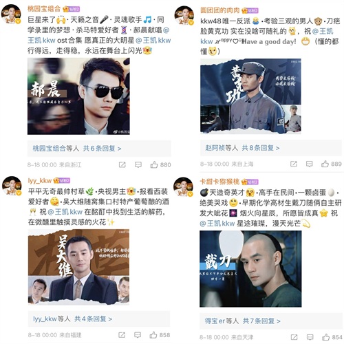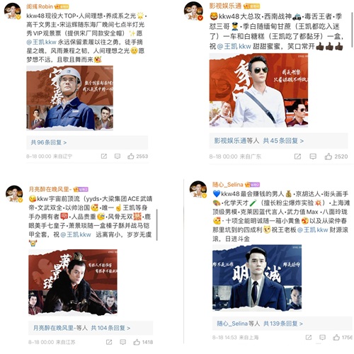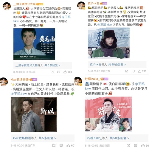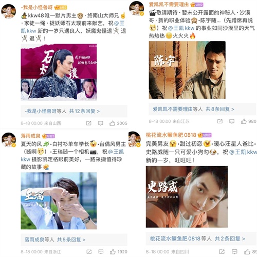 8月18日,王凯迎来了自己的生日。一直以来处事都非常低调的王凯本人并没有在自己生日这一天有什么大动作,工作室也只简单的晒照为其送上祝福,却引来热情贴心的粉丝朋友们的大量祝福留言,在其社交账号评论转发。值得一提的是,大家的评论有才有趣,将其过往的作品一一翻出,对其塑造过的角色进行了幽默总结。