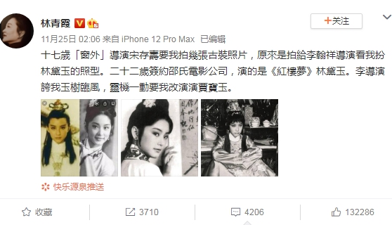 自从林青霞回归微博以来,分享的频率可以说是非常高的,不少网友表示,女神这是把微博当成朋友圈发了吧。25日凌晨两点钟,林青霞还在微博上分享自己17岁和22岁时的旧照。林黛玉的楚楚动人和贾宝玉的玉树临风,林青霞都拿捏得非常到位,网友称“刀马旦,林青霞,可男可女!真正的美人儿是雌雄同体的!”