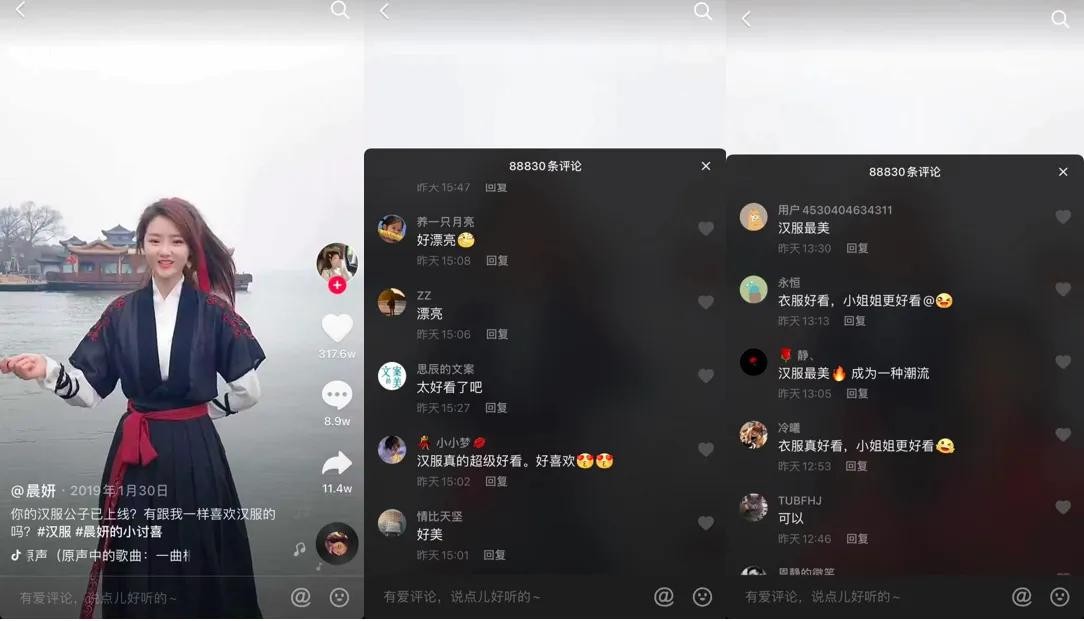 抖音上,也有很多关注汉服文化、喜欢古风服饰的达人,晨妍就是其中之一。