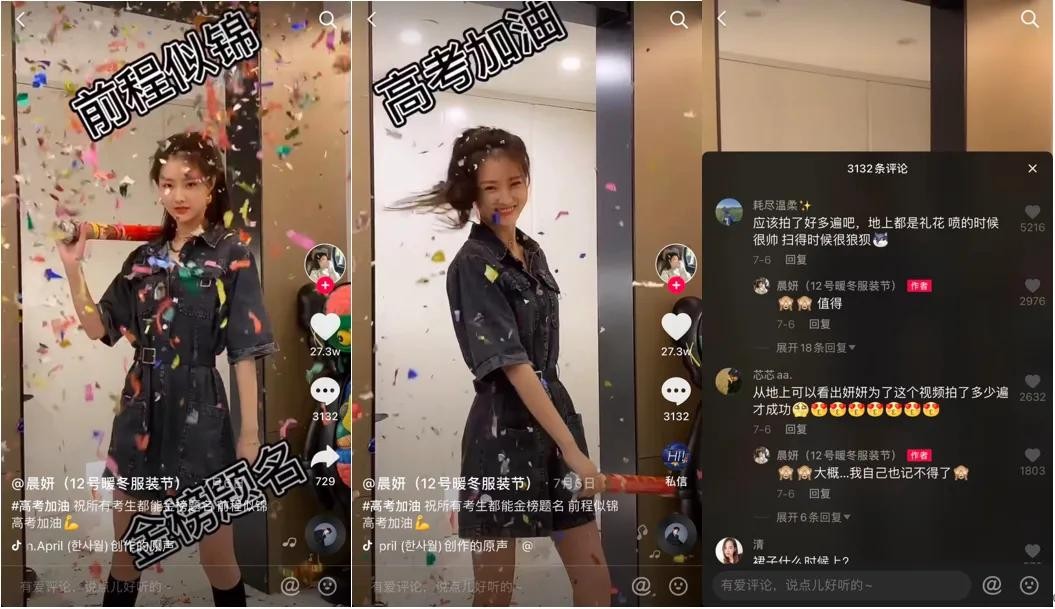 高考之际,晨妍专门录制加油视频,为即将参加高考的粉丝送上“金榜题名、前程似锦、高考加油”的祝福。有细心的粉丝根据地上的礼花数量发现,这条视频晨妍不止拍了一次。