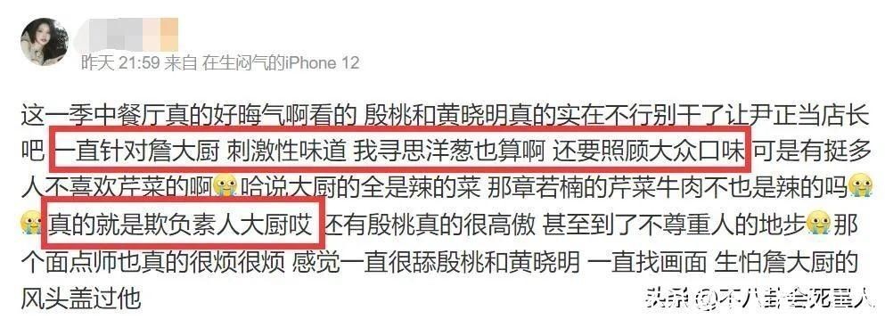更令人无语的是,最后大家定的菜,有4个都是辣菜,不免让人觉得当时就是有点挑刺詹大厨,导致网友们十分不满,认为有点欺负厨师的意思。