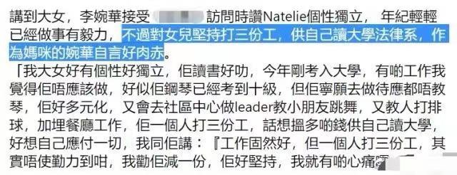 如今 18 岁的 Natelie 已经凭借着自己的努力考入大学的法律系,在采访中李婉华也透露了女儿打了很多工,自己十分心疼,想劝女儿减少一些,但女儿似乎十分清楚自己想要的是什么。