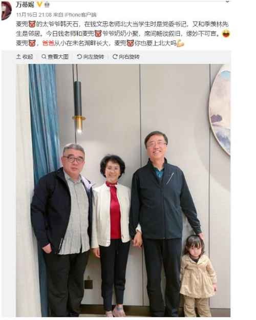 万蒂妮连老公的姓名都不愿意透漏,何况是老公的工作呢,不过大家还是能从万蒂妮的微博分享中一点点了解一下她的老公,工作应该是很不错的,还会时常去美国出差,看看他的生平,从小在未名湖畔长大,太爷爷韩天石,曾经在钱文忠老师北大当学生时是党委书记,又和季羡林先生是邻居,这种家庭,起点不是一般的高,现在的工作,不用猜就知道应该是非常高薪美好的啦。