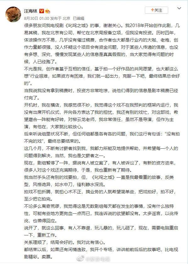 《叱咤之城》出品方发声明 回应汪海林此前爆料