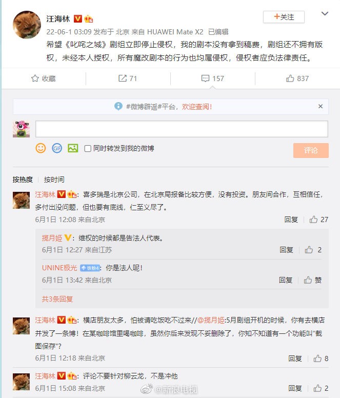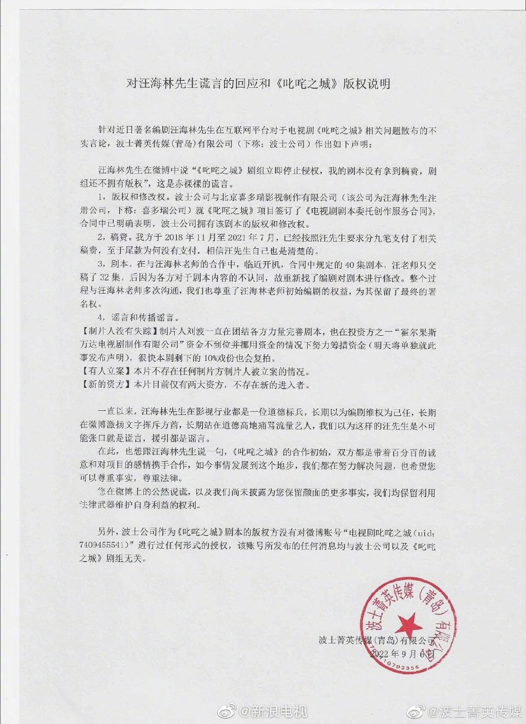 刚刚,《叱咤之城》出品方波士菁英传媒发声明,回应汪海林此前爆料没拿到《叱咤之城》稿费一事,并对《叱咤之城》版权进行说明,表示已经按照协议如约支付汪海林相关稿费,尾款为何没有支付是因合同中规定的40集剧本汪海林只交稿了32集,后因为各方对于剧本的内容无法达成一致,故重新找了编剧对剧本进行修改。同时,《叱咤之城》出品方表示不存在任何制片方制片人被立案的情况,且制片人刘波一直在团结各方力量完善剧本,也在资金不到位且资金被挪用的情况下努力筹措资金,很快剩下的10%戏份也会复拍,而波士公司也是《叱咤之城》剧本的版权方。
