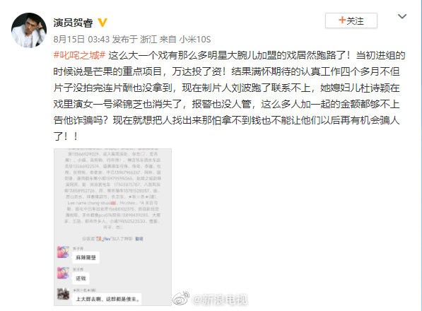 据悉,8月15日,演员贺睿曾发文曝光称《叱咤之城》剧组跑路,同时晒出名为“叱咤之城还我血汗钱”的群聊截图,群内有77人。