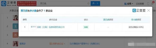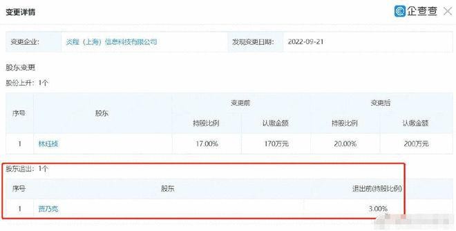网易娱乐 9 月 21 日报道 企查查 APP 显示,近日,炎程(上海)信息科技有限公司发生股东变更,贾乃亮退出该公司股东,退出前持股 3%,由林某桢接手。李小璐同为该公司股东,持股比例为 2%。截至目前,贾乃亮与李小璐已无商业关联。
