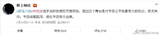 作为同场嘉宾的柯洁也力挺林恺俊:选手当时的愤怒可想而知,退出这个舞台是对节目公平性最有力的抗议,我支持你。节目组套路深,娱乐节目别太当真。
