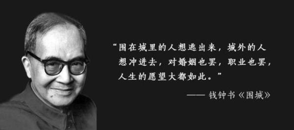 “城里的人想逃出来,城外的人想冲进去”,这句话经常被用来代表婚姻的状态,揭示了婚姻的一种困境。这句话虽不单指婚姻,但因为婚姻生活是大多数人的经历,体会深刻,对这句话感触颇深,所以使用频率很高。