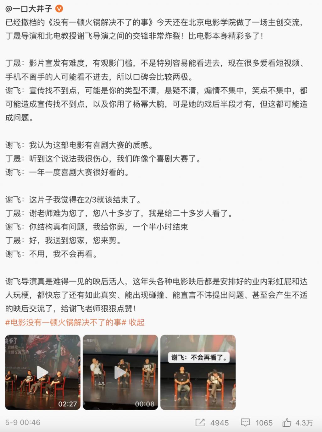 哪知导演丁晟自我感觉良好,怪宣传怪演员怪观众怪短视频,就是不觉得电影有何问题,结果被自己的老师谢飞导演当场打脸。