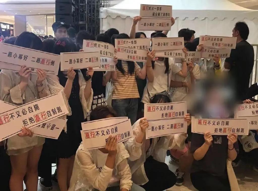 所以后来出现粉丝集体在线下活动中公开举牌抵制嘉行的大新闻,牌子上写道:"嘉行不义必自毙,拒绝嘉行自制剧""一愿小幂好,二愿嘉行倒",口号声浪一浪高过一浪。