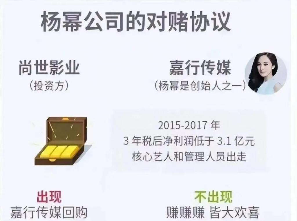 杨幂也干了一件大事,她所在的嘉行与上海东方明珠旗下尚世影业签下天价对赌协议:公司要在3年内盈利3.1亿(主要靠杨幂),否则连本带利还4个亿给投资人。