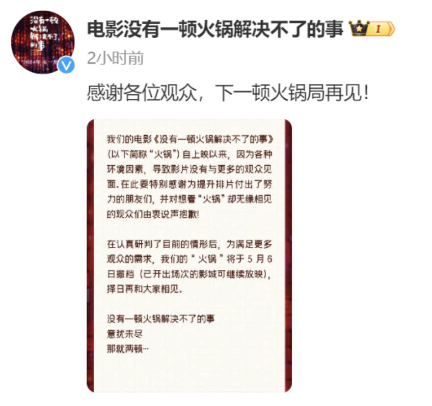 最抓马的莫过于电影《没有一顿火锅解决不了的事》定档五一、五天撤档、灰溜溜上流媒等一系列令人摸不着头脑的骚操作。