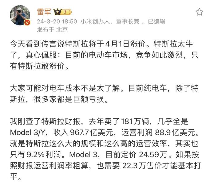 雷军曾在微博向广大网友科普,新能源汽车利润很低,就算是马斯克的特斯拉利润也只有大约 9.2%。