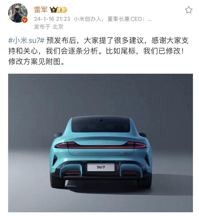 不久后雷军在微博发布了根据网友建议修改的汽车尾标方案图,各地的网友拍到了小米的测试汽车。