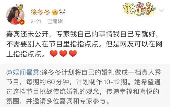 还声称要把婚礼过程按自己的想法拍一档真人秀,不需要专家给任何建议,但网友可以指指点点。