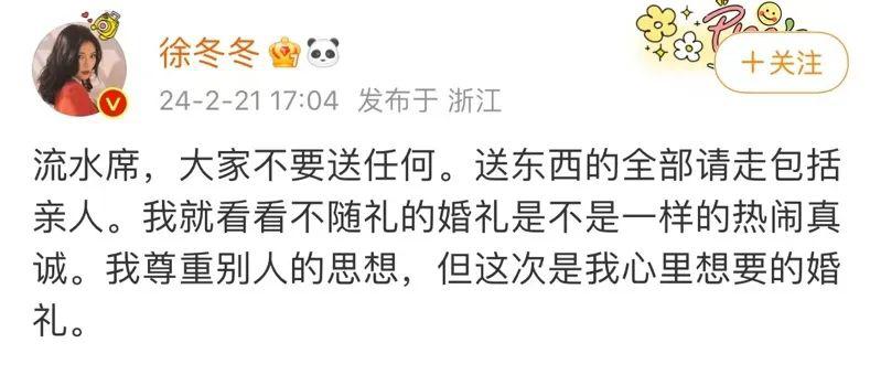 婚礼的筹备也很高调,要在哈尔滨开流水席,欢迎粉丝、网友前往,但杜绝任何形式的送礼。