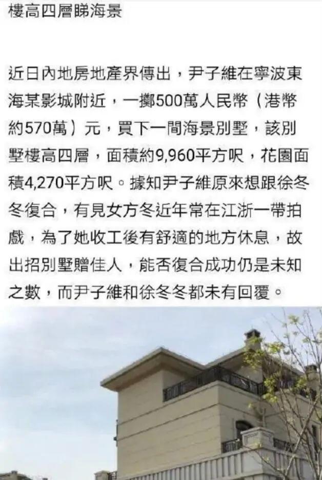 为了方便徐冬冬拍戏,尹子维豪掷 500 万在横店附近买了个四层高的海景别墅。