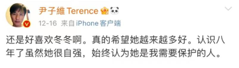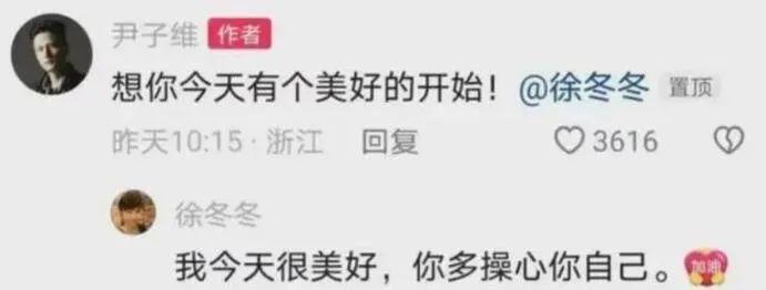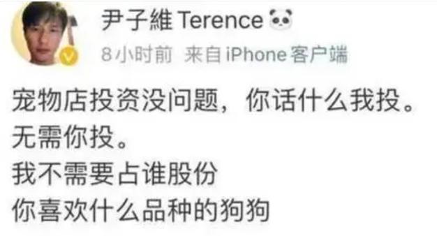 徐冬冬事业不温不火时,发微博想开宠物店。尹子维马上跳出来说 " 这个项目我投了 ",还问徐冬冬喜欢什么品种的狗狗。