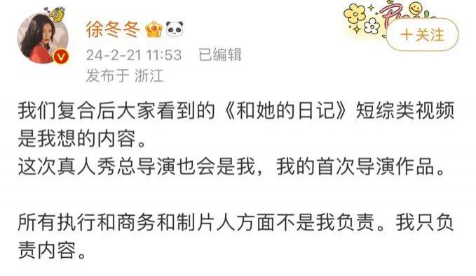 两人和好之后,拍了一档短视频综艺,叫《和她的日记》,徐冬冬希望自己的婚礼也拍成一个综艺。